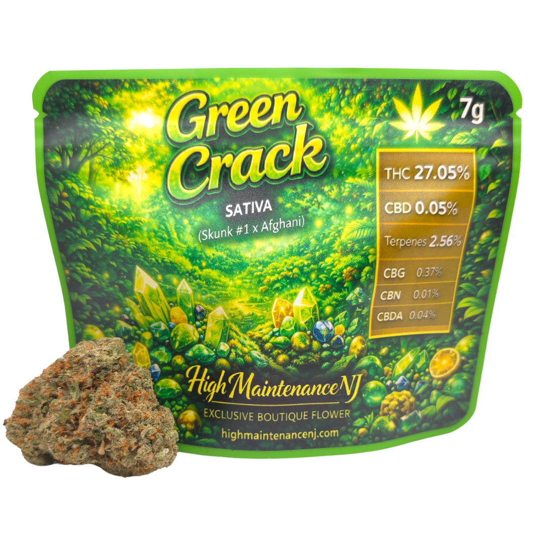 Green Crack is a legendary sativa known for its sharp, energizing effects and vibrant terpene profile. Bred from Skunk #1 x Afghani, this strain delivers a powerful cerebral boost that keeps you focused, motivated, and ready to take on the day.
