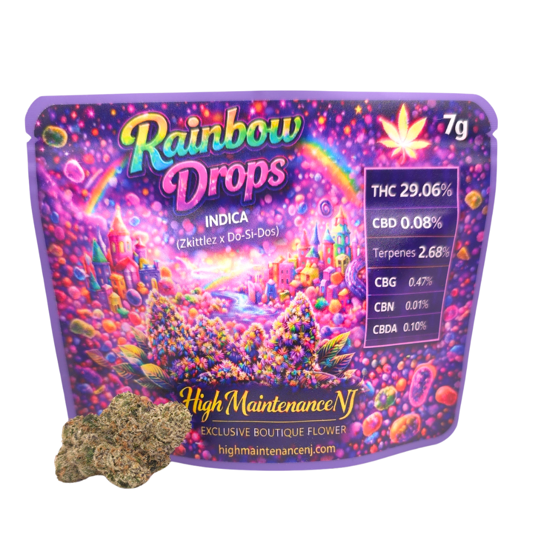 Rainbow Drops is a flavor-packed indica that brings together the candy sweetness of Zkittlez with the creamy, relaxing depth of Do-Si-Dos. This strain is all about rich terpene expression, vibrant aroma, and a smooth, full-body experience.
